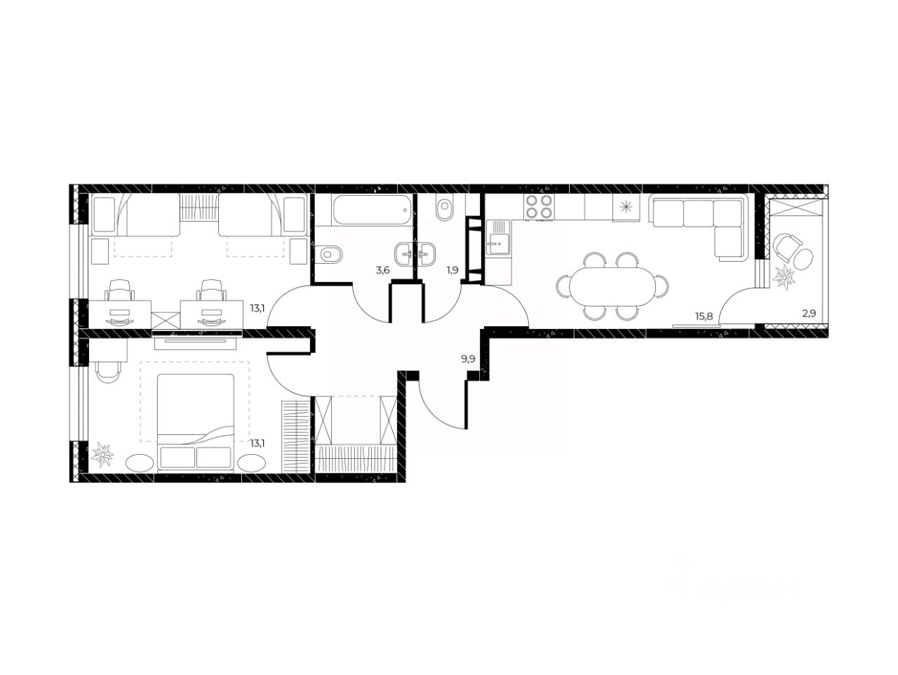 Общая площадь58,9 м²
