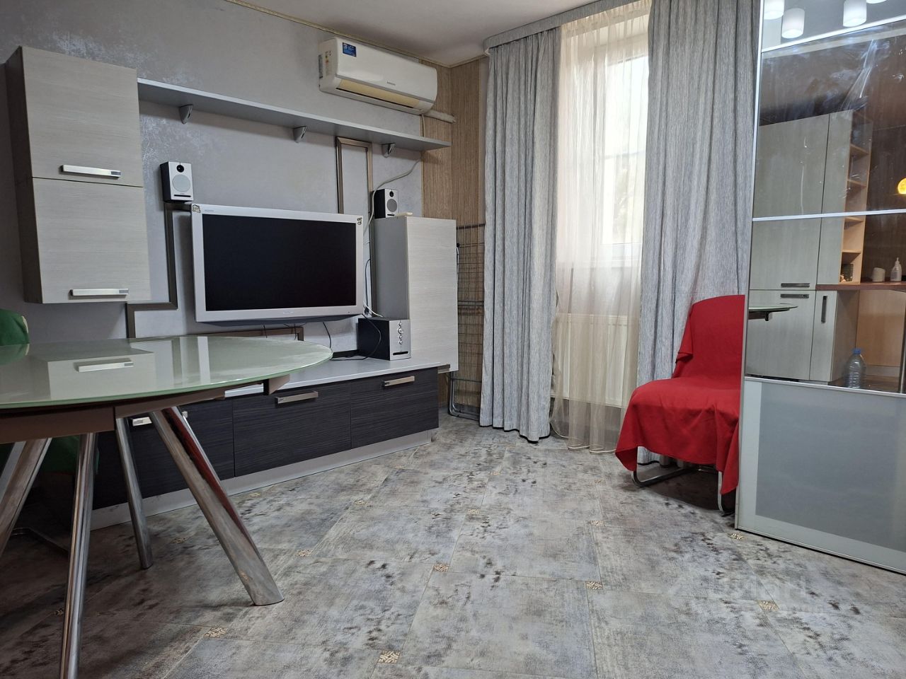 большой зеркальный шкаф-купе, кондиционер, телевизор.