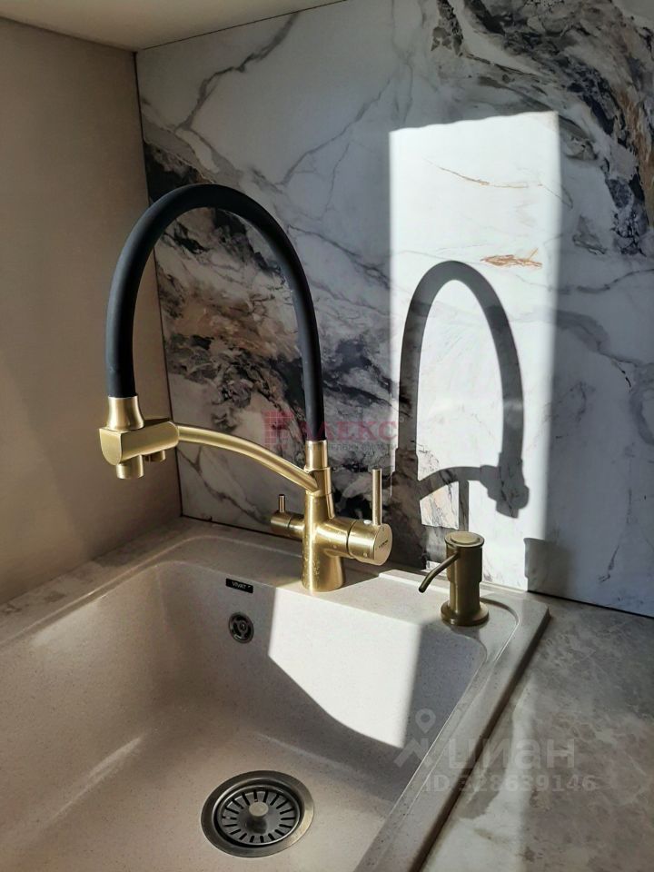 Кухня полностью оборудована бытовой техникой - встроенный холодильник, духовой шкаф, СВЧ, варочная панель, вытяжка и посудомоечная машина. Каменная мойка имеет смеситель со специальным краном под фильтрованную воду. Обеденный стол под мрамор раздвижной и комплект мягких стульев.