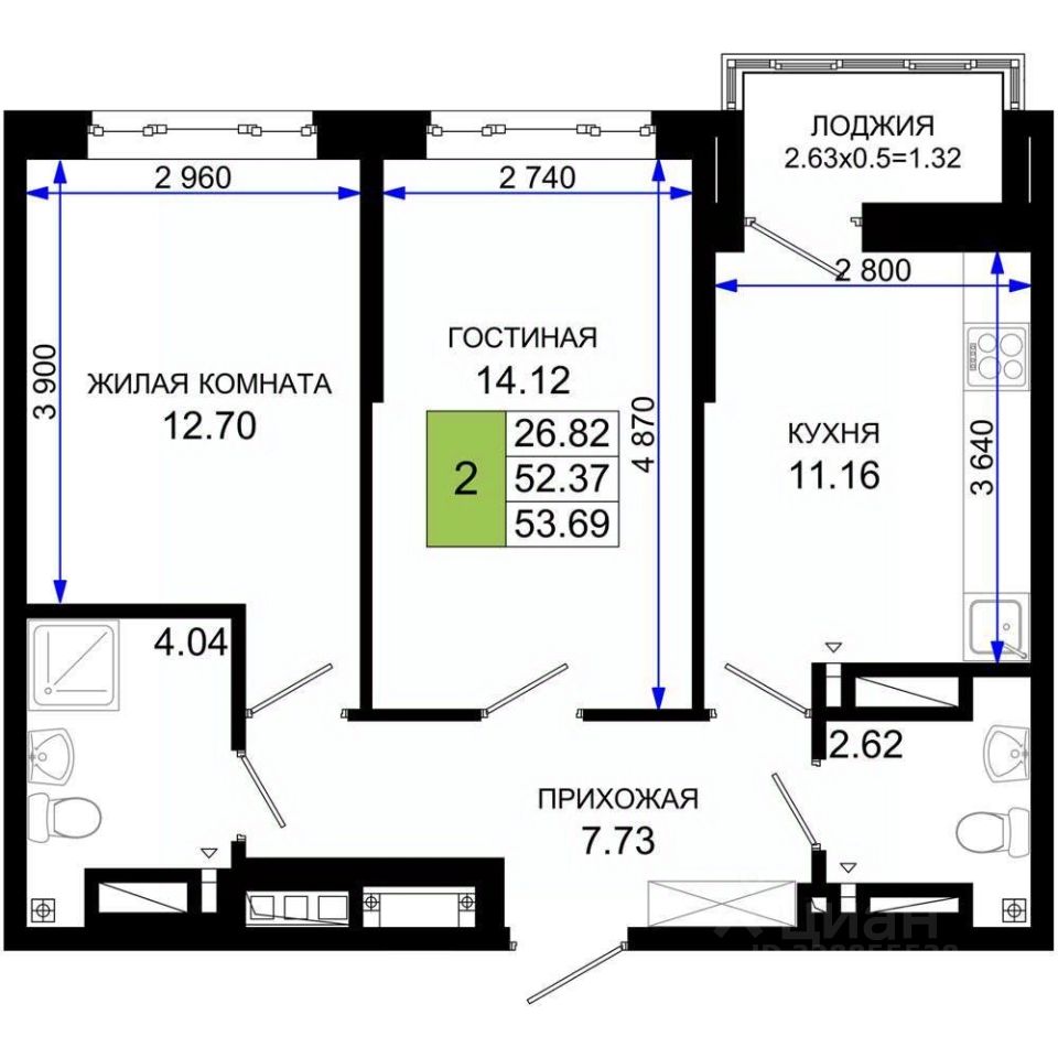 Жилая площадь 26.82 м2, кухня 11.16 кв. м, ремонта нет.
