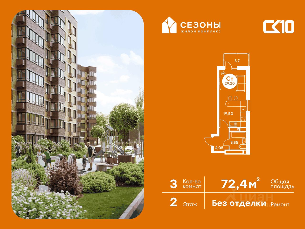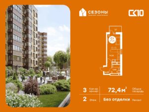 Продаётся 3-комнатная квартира в строящемся доме (Дом 2), срок сдачи: IV-кв. 2026, общей площадью 72.4 кв.м., на 2 этаже. ЖК Сезоны 1 это уникальный проект, созданный вдалеке от шума и суеты мегаполиса. Радоваться каждому дню в любом возрасте здесь будет проще - внутреннее состояние удовольствия поддерживает окружающая обстановка.