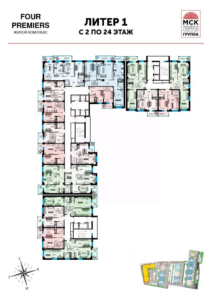 - 4 литера по 24 этажа.
