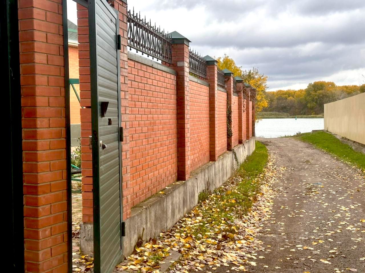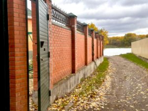 Территория огорожена кирпичным забором на фундаменте - лента, ворота - распашные, электрические.