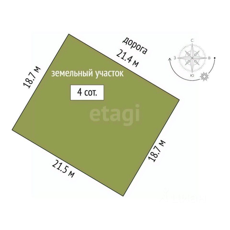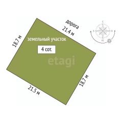 Участок площадью 4 сотки расположен в коттеджном поселке в 15 минутах езды от города. Поселок отличается продуманной инфраструктурой: асфальтированные дороги, детская площадка, школа и детский сад в пешей доступности. В шаговой доступности находятся храм и набережная с возможностью прогулок и рыбалки.