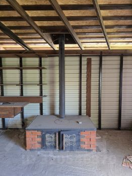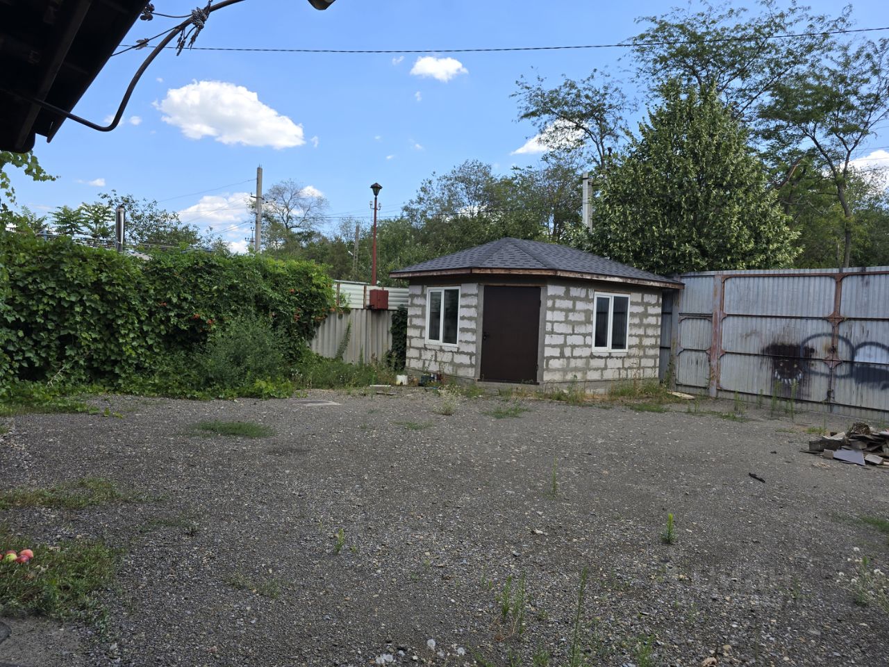 Огромный крытый благоустроенный навес тамбур при входе, защищённый от ветра и дождя, со встроенными шкафами, с раковиной, печью для казана и др.