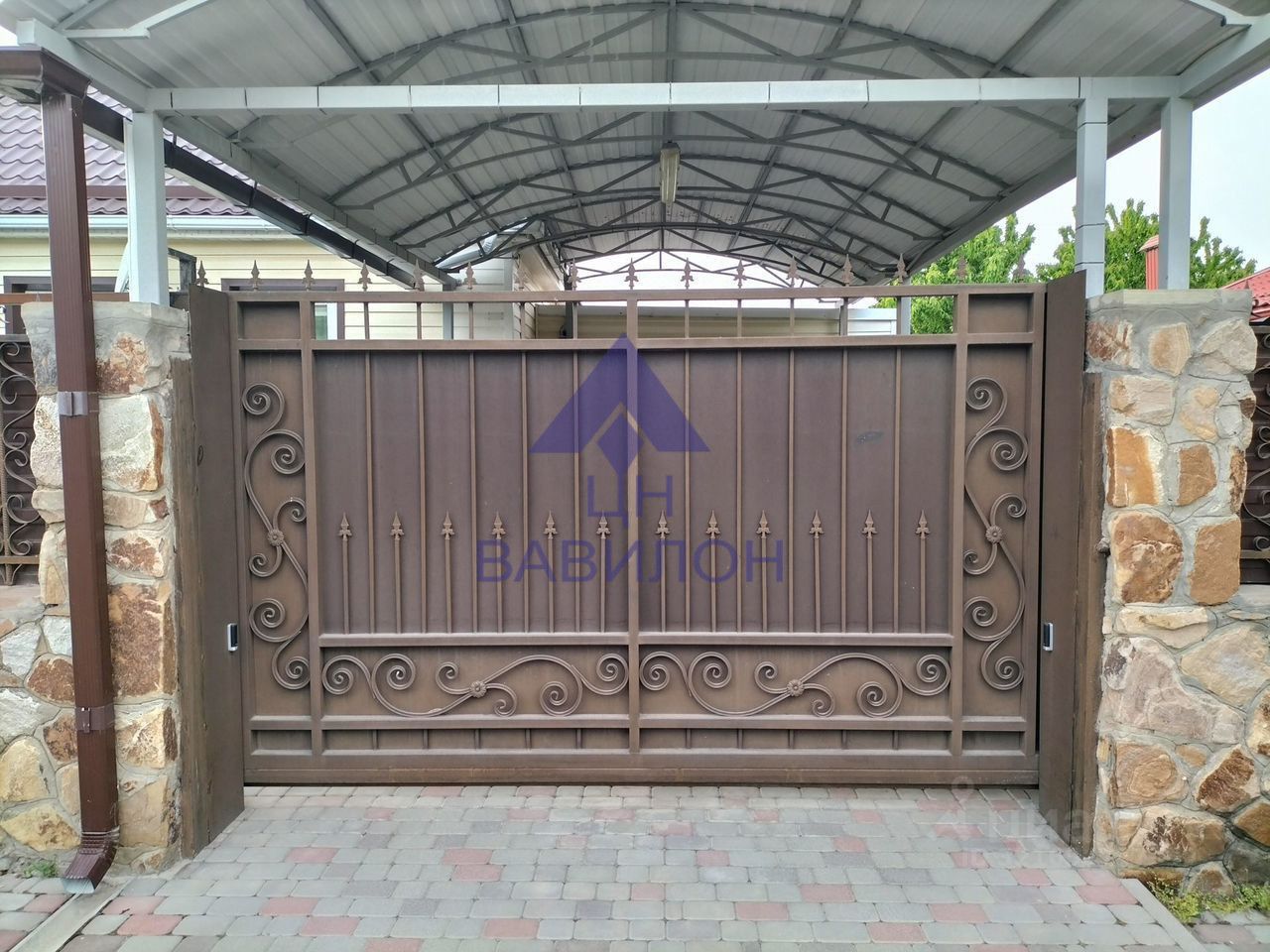 Надежный забор: Забор выполнен из бутового камня, а проемы и входная дверь на участок изготовлены из металлоконструкций. Автоматические откатные въездные ворота обеспечивают удобство и безопасность.