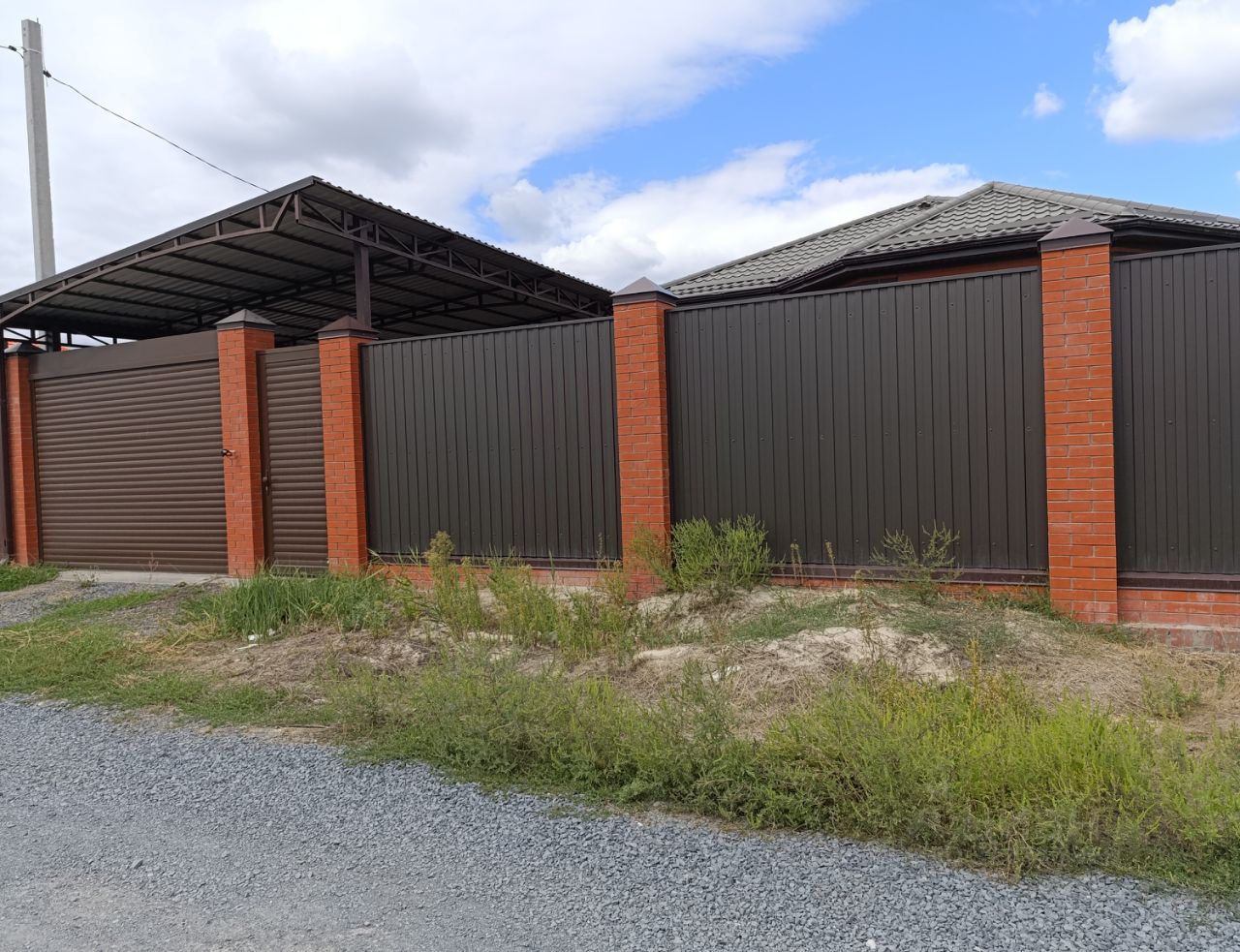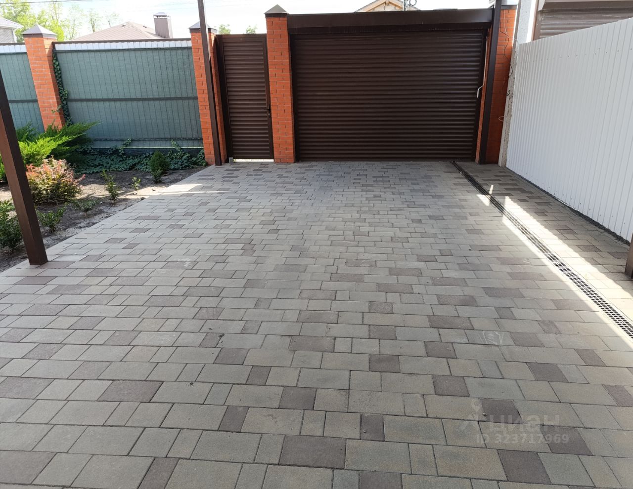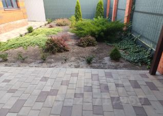 Двор выложен тротуарной плиткой + газоны и декоративные растения, навес для машин. Установлен хороший забор по всему периметру с автоматическими воротами, въезд/ парковка на 2-3 автомобиля, за домом хоз. постройка с подвалом и мангальной зоной.