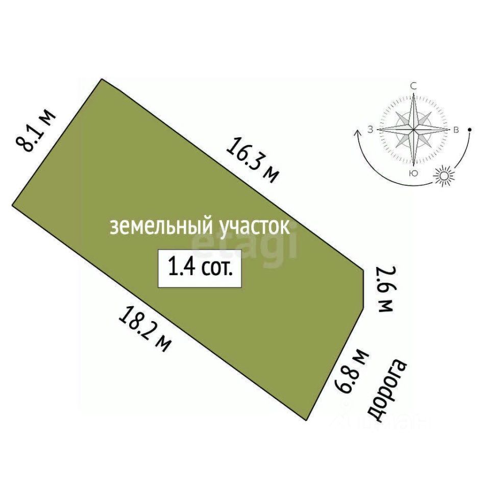 Общая площадь земельного участка - 6 соток форма участка - прямоугольная. Участок имеет выход на две улицы.