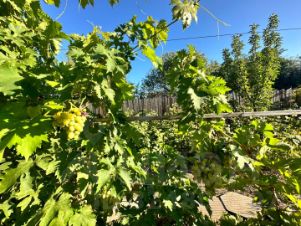 На участке растут плодовые деревья, малина и виноградник. Всё плодоносит.