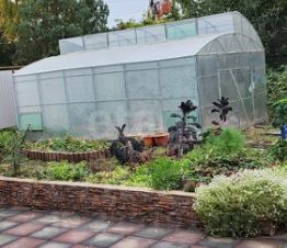 во дворе: цветник на фасаде, теплица, фруктовые деревья, малина и др.;