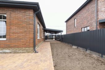 Участок разработан, дорожки и въезд для автомобиля застелены тротуарной плиткой. Для авто есть навес.