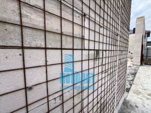 Коробка выполнена из качественного газоблока, частично сделана решетка для оштукатуривания фасада.