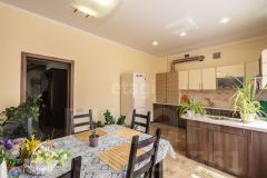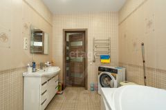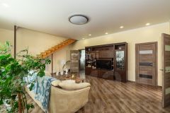 На первом этаже расположены: большая гостиная 38 кв.м., кухня-столовая 21 кв.м., кабинет 14 кв.м., сан. узел 8 кв.м., прихожая 11 кв.м., установлен тёплый пол.