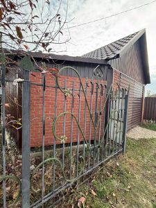 Земельный участок в собственности, прямоугольной формы размером 12 соток. На участке растут декоративные туи, и несколько молодых саженцев плодовых деревьев. Из построек во дворе есть добротная летняя кухня, гараж для автомобиля, сарай из металлопрофиля, большой навес.
