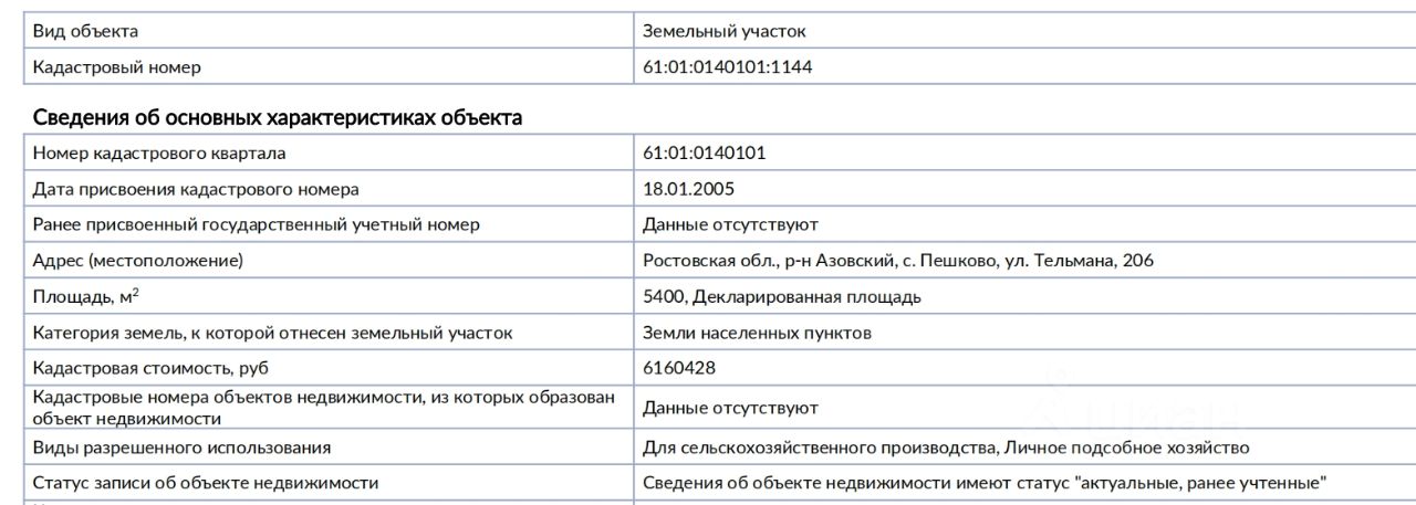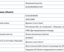 Участок в тихом районе с. Пешково. Газ, вода, электричество, связь непосредственно рядом с участком. Подъезд круглый год. Заезд с двух сторон (с фасада - хорошая насыпь (подъезд круглый год, с огорода грунтовка - подъезд по погоде)) В селе есть школа, детский сад, почта, банкомат, кафе, магазины. Через село походит трасса на Крым. 7 мин. до Азова и 30 мин. до г. Ростова-на-Дону. 10 мин до Таганрогского залива Азовского моря Участок отлично подойдёт для постройки дома и ведения личного подсобного хозяйства, рядом заливной луг, река (см расположение участка на карте). Реальному покупателю хороший торг. Реальный адрес Тельмана 206, Кадастровый номер 61:01:0140101:1144 (межевания нет) (ЦИАН само ставит 204), по фасаду чуть более 20 метров (Да участок длинный) Цена снижена на 500 т.р, пока в продаже интересующая меня недвижимость