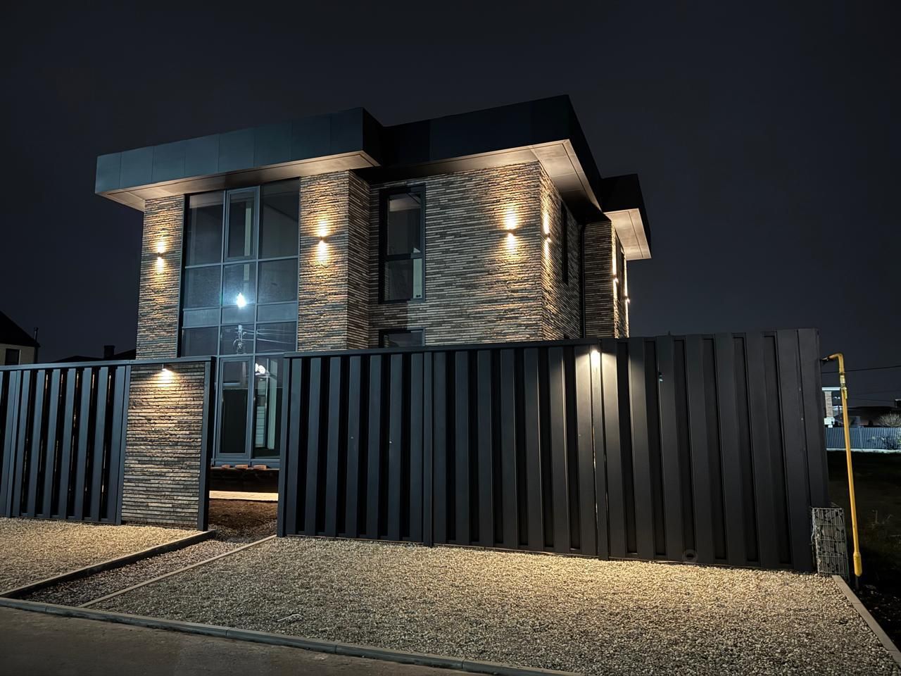 - Стильный, продуманный экстерьер с освещением, подчеркивающим особенности фасада.