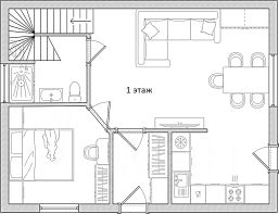 1-этаж: Прихожая. Кухня-Гостиная с выходом на террасу). Спальня 1 (гостевая). Сан. узел (совмещённый).