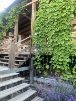 Большие окна, на первом этаже окна в пол, выход через портал на террасу