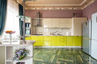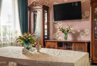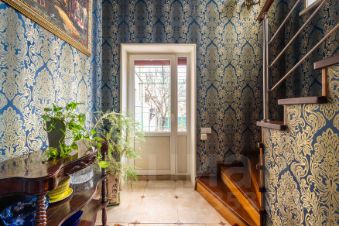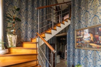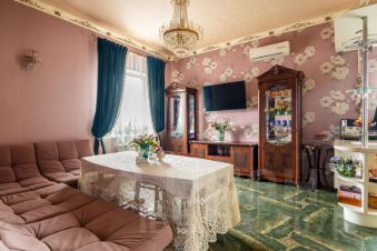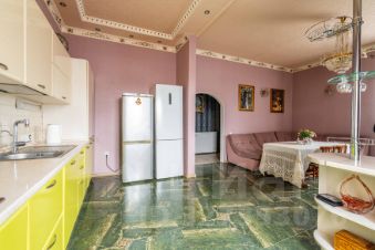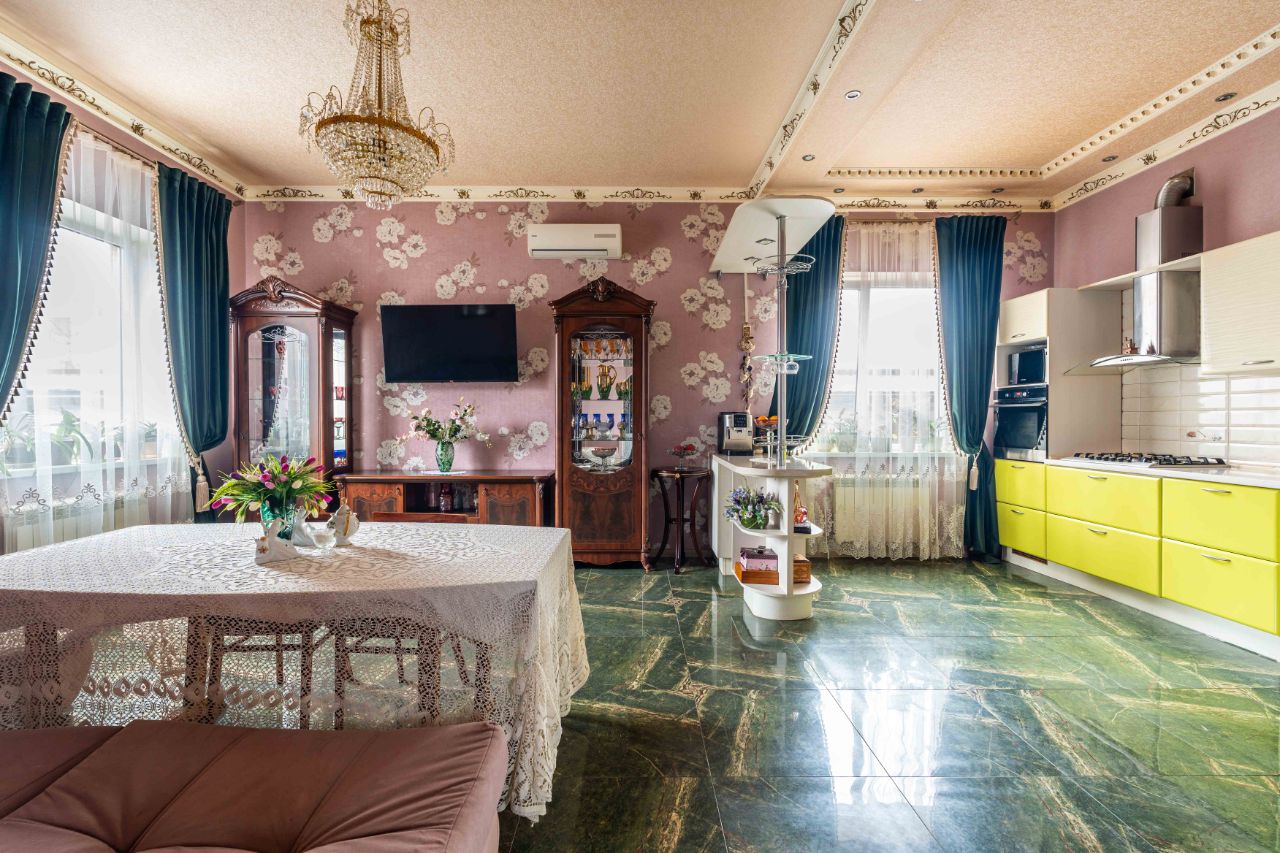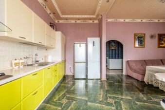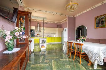 На первом этаже располагается кухня -гостиная 34 м2, высота потолков 3, 2 метра,пол теплый ,напольное покрытие -керамогранит ,из мебели останутся встроенная кухня с техникой, угловой диван, холодильник, санузел совмещённый оборудован системой теплый пол,комната 12,7 м2,холл оборудован системой теплый пол, остаётся встроенный шкаф-купе и шкаф для хранения обуви.