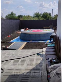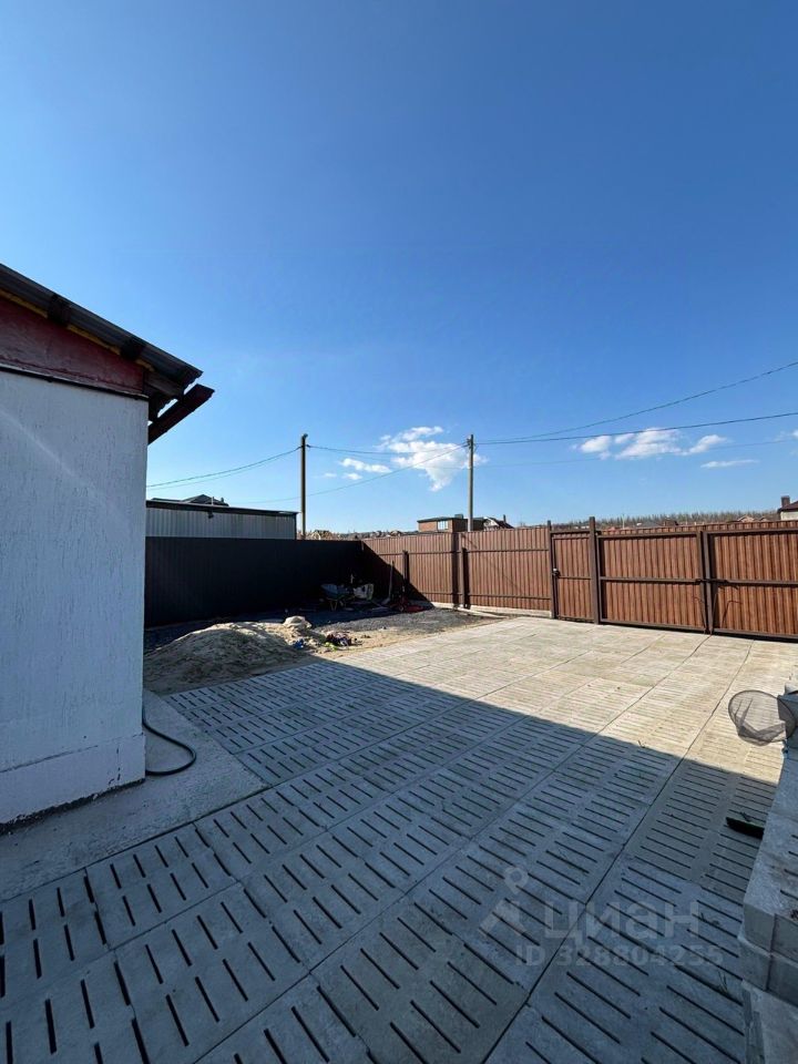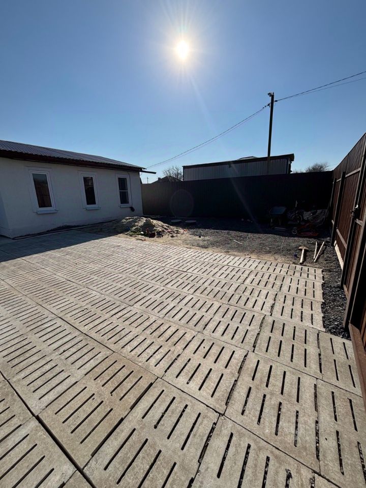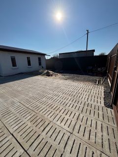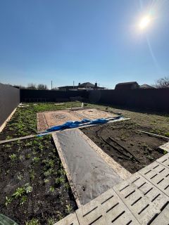 Участок ровный, благоустроен, спецтехникой снят слой старой земли со всеми сорняками, постелен геотекстиль по всему участку, завезен новый плодородный грунт. На придомовой территории уложены бетонные щелевые плиты, что дает возможность разместить перед домом 3 автомобиля. По всему периметру участок огорожен забором из металлопрофиля.