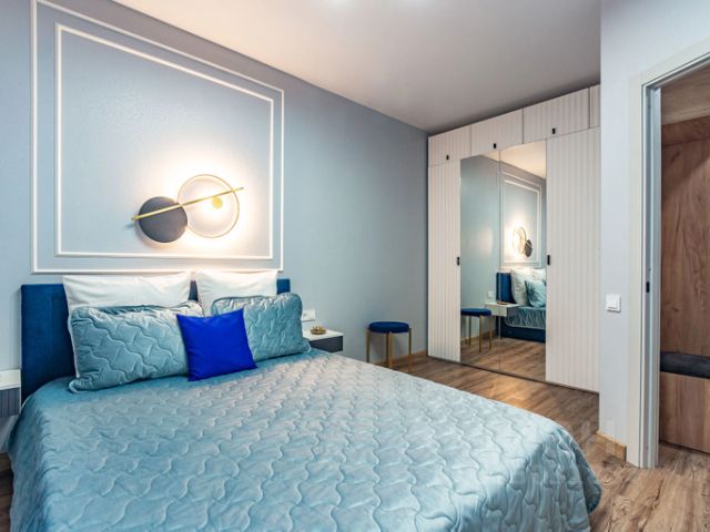 Спальня со стильными светильниками и удобной кроватью