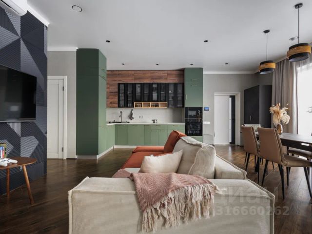 Большая кухня - гостиная (50 кв. м) с панорамными окнами. Там же находится акустическая система и проектор.