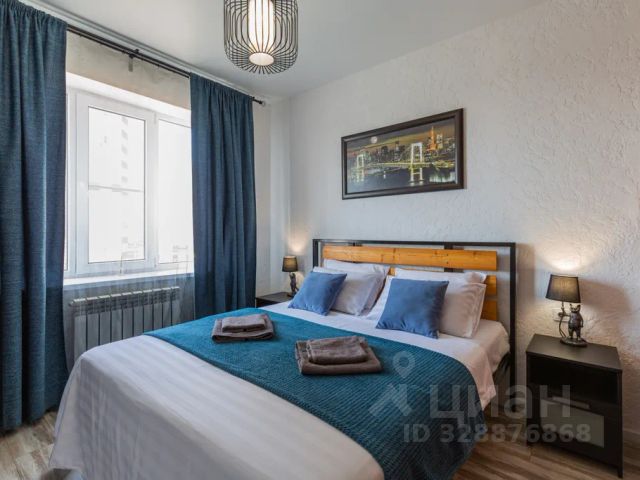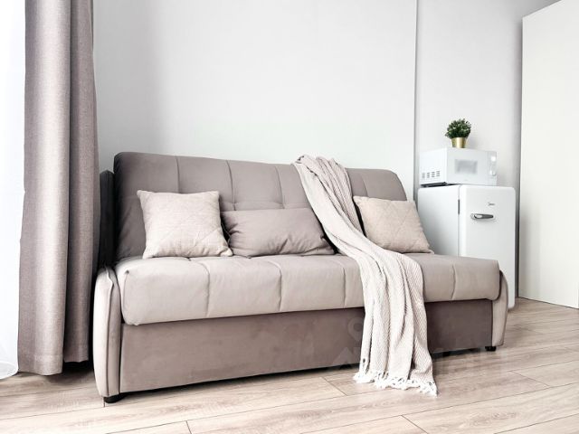 В спальной зоне двухместная кровать 140х200 см с удобным матрасом, хлопковым постельным бельем и стильными подушками, а также уютные шторы, которые создают атмосферу уединения и спокойствия.