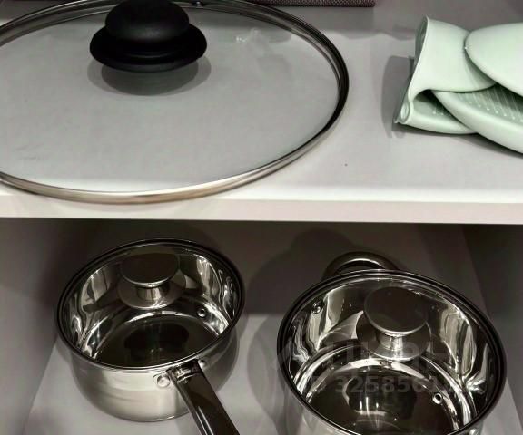 На кухне: холодильник, микроволновка, индукционная печь, электрический чайник, посуда