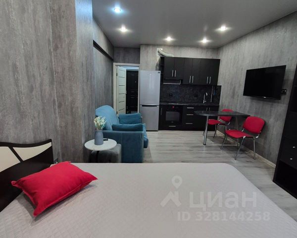 Сдаётся квартира-студия в аренду, на длительный срок, с отличным ремонтом. Вся мебель с техникой, интернет. В квартире: большая кровать с хранением постельного белья, Сплит, телевизор, стиральная машинка, холодильник, кухонный гарнитур с плитой и вытяжкой, барная стойка, стулья. Лоджия утепленная с панорамными окнами. В квартире есть интернет. Коммунальные не высокие. Инфраструктура вся рядом, в домах множество магазинов.