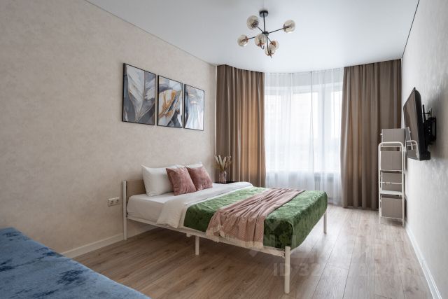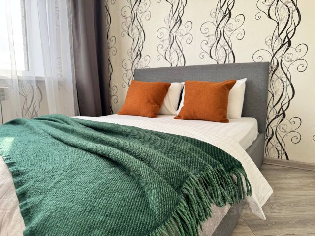 В спальной зоне двухместная кровать 140х200 см с удобным матрасом, хлопковым постельным бельём и стильными подушками, а также уютные шторы, которые создают атмосферу уединения и спокойствия.